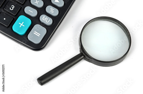 calculating machine, count, keyboard, key, screen, signs, number, plastic, glasses, magnifier, magnifying glass, handle, research, search, survey