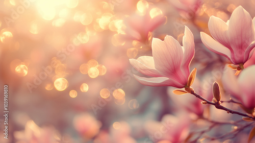 Magnolia blossom tree branch springtime pink flower bright light bokeh background