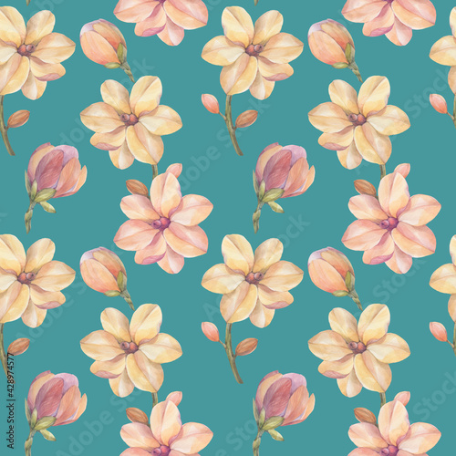 Magnolia seamless botanical pattern. Watercolor botanical ornament. Pink flowers on a birch background.