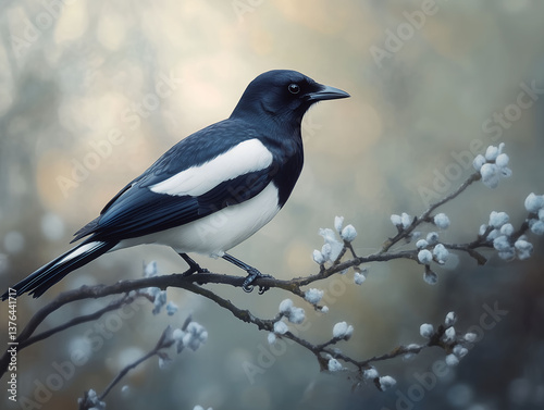 magpie, bird, perched, tree branch, nature, wildlife, soft focus, aethereal, winter scene, avian, feather, beak, morning light, natural beauty, elegant, closeup, photo, serene