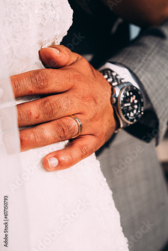 Main du marié posé sur robe de son épouse avec alliances de mariage