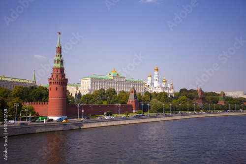 main view of the Moscow Kremlin, street cleaning is underway, a pleasure boat is sailing along the river