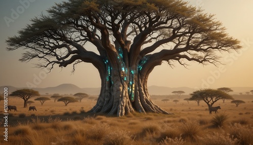baobab, tree, african, savanna, landscape, sunset, nature, wildlife, glowing, magical, africa, desert, wild, animal, sunrise, golden hour, mystical, ancient, ecosystem, environment, tropical, savanna, digital artwork, fantasy, serengeti