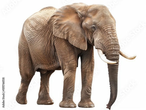 majestic african elephant rendered in hyper-realistic computer graphics, showcasing intricate skin texture and tusks, posed gracefully against pure white backdrop