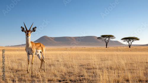 antelope, savanna, mountain, wildlife, nature, landscape, sunny, african, animal, horned, standing, serene, environment, flora, fauna, tranquil, scenic, wilderness, habitat, tall grass, clear sky, solitary, majestic, wild, herbivore, safari, ecosystem, natural, beauty, peaceful, arid, dry, tree