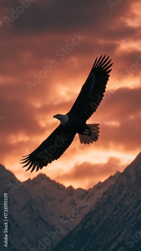 Majestic bald eagle flying wings spread against an epic orange cloudy sky mountains