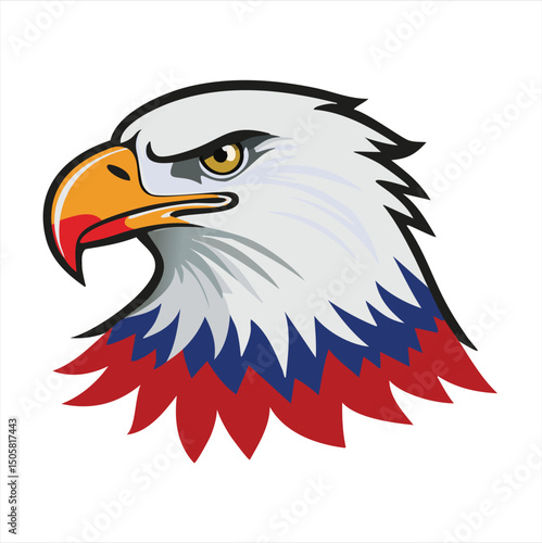 bald eagle, patriotic, us, us, freedom, liberty, bird of prey, graphic design, logotype, emblem, mascot, fierce, powerful, strong, wildlife, animal, bird, head, profile, white background, red, white, blue, colours, american flag, 4th july