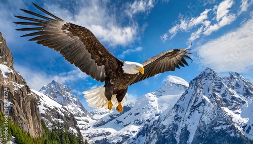 Majestic Bald Eagle Soaring Above Snow-Capped Mountains in a Crisp Blue Sky