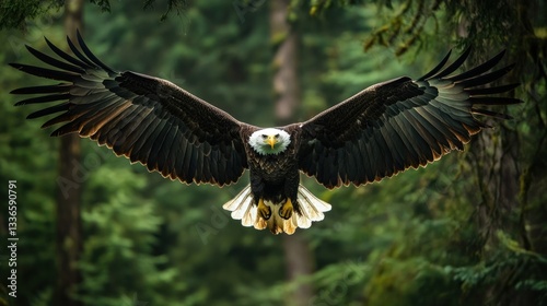Majestic bald eagle soaring through lush forest, wings spread wide in powerful flight