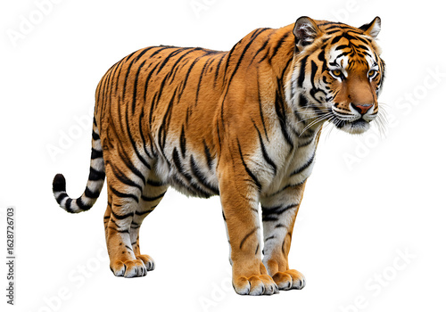 tiger, bengal, animal, wildlife, big, cat, predator, mammal, felino, striped, orange, black, stripes, powerful, majestic, dangerous, zoo, safari, jungle, nature, conservation, endangered, species, creature, wild, domestic, pet, portrait, full, body, standing, isolated, white, background, studio