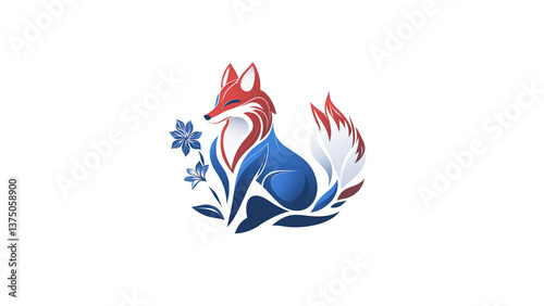 fox, red fox, illustration, graphic, design element, logotype, emblem, branding, wildlife, nature, flower, blue flower, floral, fauna, elegant, majestic, graceful, whimsical, cute, cartoon, artistic, abstract, modern, contemporary, digital artwork, artwork, fantasy, mythical, creative, vibrant, colourful, red, blue, white, dark background, isolated