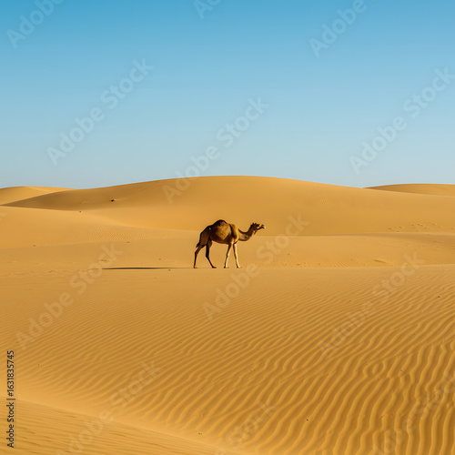 Majestic camel journeys across stunning desert landscape under a vast clear blue sky, a serene travel experience