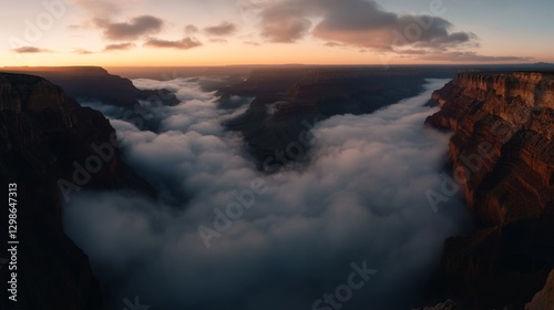 Majestic clouds embrace the rugged mountain ridge at dusk. Generative AI