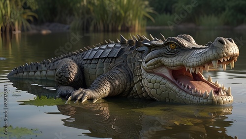 crocodile, muscular, reed, water lily, reflections, untamed, majestic, powerful, ancient, reptile, nature, wildlife, predator, amphibious, swamp, wetland, basking, submerged, detailed, textured, realism, habitat, scenery, landscape, jungle, tropical, water, river bank, flora, fauna, visual, design, digital artwork, render, photorealistic, animation