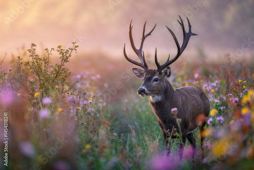 spring, cervid, stag, antler, wildlife, meadow, flower, blooming, wildflower, sunrise, mist, morning, nature, field, colourful, majestic, outdoors, natural, fresh, vibrant, animal, peaceful, forest, sunlight, freedom, floral, wild, scenic, serenity, wilderness, fauna, beauty, rural, habitat, growth, renewal, roam, seasonal, environment, charming, high-coloured, creature, harmony, earthy, pasture, dawn, survival, strength