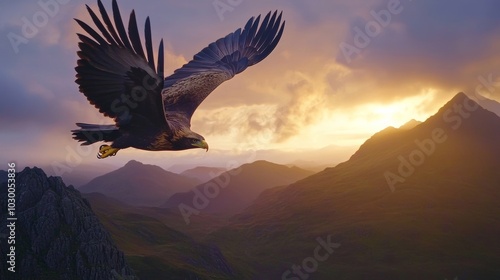 Majestic eagle soaring over mountain landscape at sunset, capturing the beauty of nature in flight and freedom.