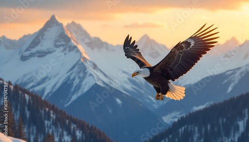 Majestic eagle soaring over snow-capped mountains during golden hour