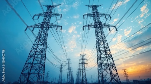 Majestic Electric Power Lines Against a Colorful Sky During Sunset with Silhouetted Transmission Towers and Electrical Wires