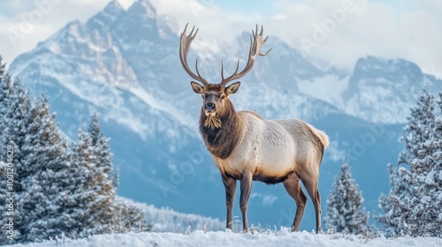 elk, majestic, snow, hill, mountain, wildlife, nature, winter, animal, landscape, forest, scenic, outdoors, fauna, horn, antler, grazing, serene, peaceful, beautiful, herbivore, environment, wilderness, snow-covered, chilly, calm, tranquil, palmy, ecology, photo, scenic view, frosty, cold, mountainous, rugged, animal kingdom, vibrant