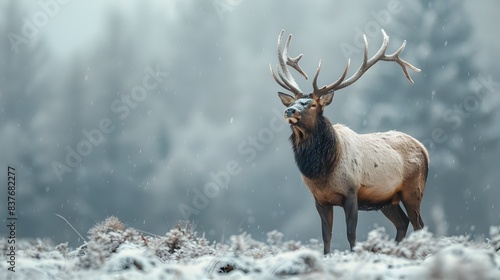 Majestic Elk Stands Tall in Snowy Wilderness Impressive Antlers Commanding Attention
