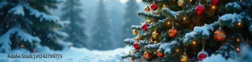 majestic fir Christmas tree adorned with colorful ornaments in snowy forest surroundings, forest, fir