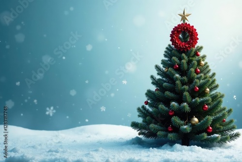 Majestic fir tree topped with a stunning crimson wreath, winter, bow