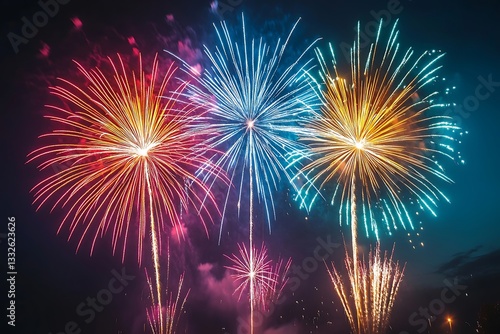 fireworks, celebration, night, sky, colourful, bright, sparkle, burst, display, festive, holiday, party, event, spectacular, vibrant, illumination, dazzling, glow, light, bokeh, abstract, background, texture, design, pattern, blue, teal, pink, orange, gold, pyrotechnic, majestic, dramatic, radiant, fiery, explosion, streak, trail, cosmic, spectacle, wonder, artistry, night sky, summer