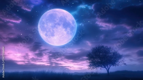 Majestic Full Moon Illuminating Serene Landscape with Solitary Tree Under Colorful Sky at Twilight