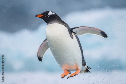 Majestic Gentoo Penguin Mid-Leap in Icy Splendor - Wildlife Elegance and Motion