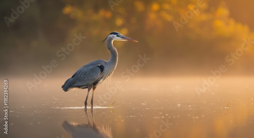 Majestic great blue heron, shallow water reflection, golden hour light, soft focus background, nature photography, wildlife portrait, serene wetland scene, muted earth tones, misty atmosphere, high de