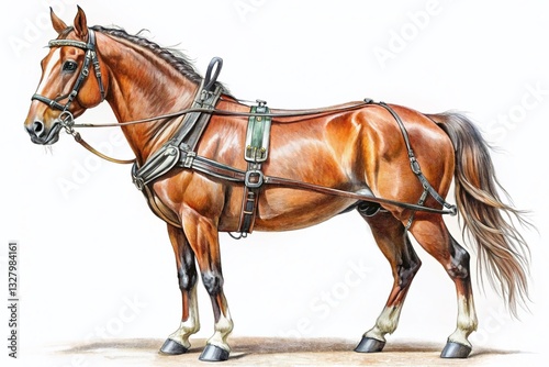 Majestic Harnessed Purebred Horse Hand Drawing - Right Side Copy Space Stock Photo