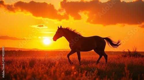Majestic horse silhouetted against a vibrant sunset, galloping freely across a golden field, mane flowing in the warm evening breeze. A breathtaking scene.