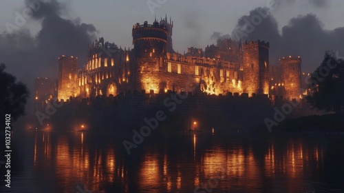 castle, illuminated, dusk, water, dramatic, architecture, mediaeval, fortress, twilight, night, glow, stone, historical, fantasy, ancient, mystery, tower, battlement, fosse, enchanting, majestic, cloud, sky, ambience, serene, peaceful, grandeur, legendary, scenic, picturesque, landmark, heritage, light, shadow, artistic, sunset, romance, fairy tale, mythical, gothic, timeless, mysterious, enchantment, tranquil
