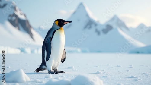 Majestic King Penguin Standing on a Snowy Landscape with Mountains in the Background