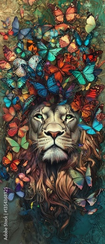 lion, butterfly, colourful, wildlife, art, painting, animal, nature, mane, portrait, surreal, dreamlike, intricate, detailed, mystical, vibrant, calm, serene, peaceful, green eye, fantasy, illustration, majestic, beauty, delicate, wing, forest, whimsical, enchanting, transformation