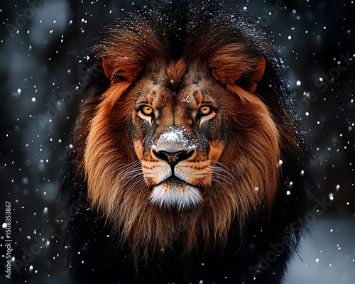 lion, snow, winter, wildlife, animal, nature, majestic, powerful, predator, sharpened, portrait, closeup, strong, courage, brave, wild, glacé, sharp, eye, face, mane, hair, fur, roar, hunt, survival, strength, beauty, king, forest, dark, cold, snowflake, snowy, freezing, wildness, adventure, courageous, untamed, photo, photo