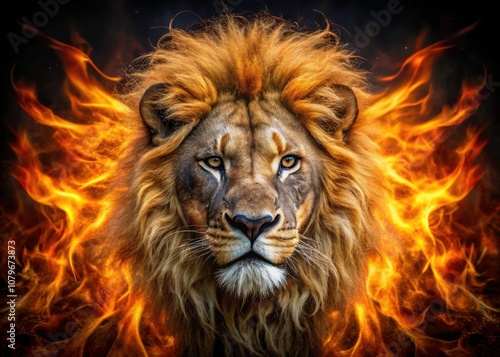 lion, fire, flames, dark background, strength, power, majesty, animal portrait, wildlife, nature, symbolism, art, photo, vivid colors, contrast, regal, fierce, aethereal, dynamic, burning, intense, captivating