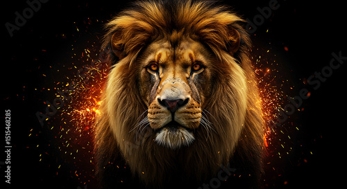 Majestic lion portrait against a backdrop of fiery sparks.