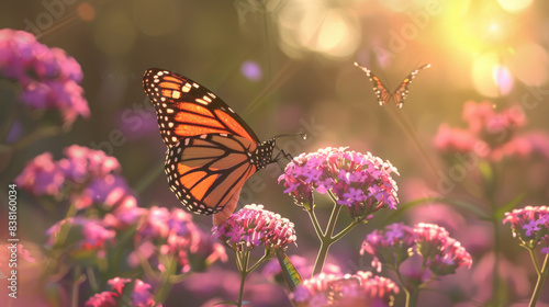 Majestic monarch butterflies on pink blooms in a dreamy garden.