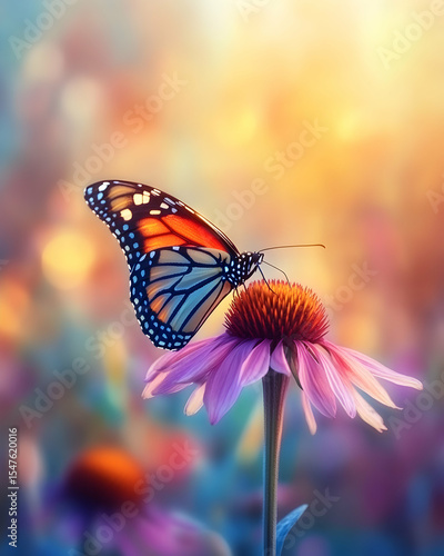 Majestic monarch butterfly delicately perched on a vibrant purple coneflower, bathed in warm sunset light. A breathtaking image showcasing nature's beauty.