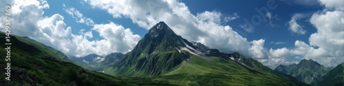 Majestic Montains: A Summer Landscape with Snow-Capped Peaks and Fluffy Clouds in a Heavenly Panorama
