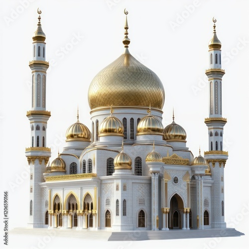 mosque, islam, architecture, dome, minaret, gold, white, religious, building, islamic, structure, design, three-dimensional, rendering, digital, art, illustration, faith, spirituality, culture, heritage, travel, landmark, symbol, religion, prayer, worship, community, peace, belief, spirit, sacred, holy, ornamentation, intricate, detail, elegance, grandeur, majestic, brilliancy, magnificent, beauty, artistic, architectural, muslim, model, image, render