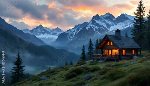 Majestic mountain landscape, cozy log cabin with warm glowing windows
