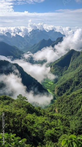 Majestic mountain landscape with clouds and lush greenery under a bright sky