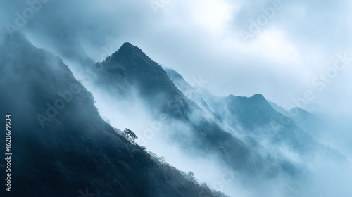 Majestic mountain peaks shrouded in ethereal mist. Atmospheric landscape evoking mystery, serenity, and adventure. Ideal for travel, nature, or inspirational themes.