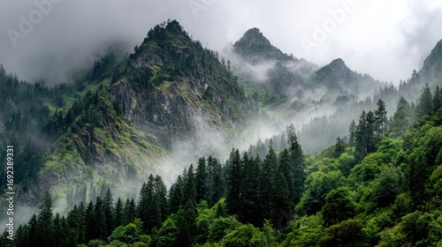 Majestic Mountain Peaks Shrouded in Mist and Lush Green Forests