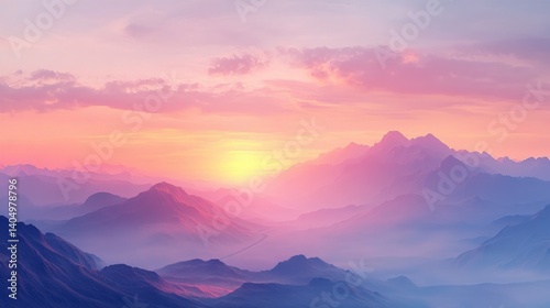 mountain, rising, range, layered, sky, colouring, sunset, colourful, fog, rolling, vale, distant, haze, mist, glow, illuminating, pastel, purple, pink, atmospheric, horizon, scene, scenic, vista, landscape, nature, outdoors, aerial, dramatic, peaceful, travel, environment, background, wallpaper, desktop, artwork, illustration, rendering, digital, nobody