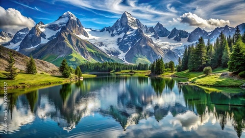 Majestic mountain range with snow-capped peaks and serene lakes, snow, lake, scenery, landscape