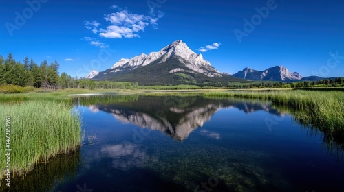 mountain, lake, water, sky, blue, green, vegetation, grass, reed, tree, forest, peak, summit, landscape, nature, scenery, tranquil, calm, serene, peaceful, majestic, beautiful, scenic, summer, sunlight, daylight, canada, rocky, mountain, cloud, clear, pristine, environment, wilderness, panoramic, view, horizon