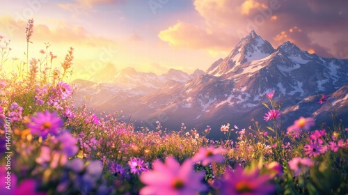 mountain, sunrise, wildflower, flower, nature, landscape, scenery, beautiful, scenic, majestic, peaceful, serene, tranquil, calm, breathtaking, inspiring, vibrant, colourful, spring, summer, alpine, meadow, field, bloom, blossom, flower petals, pink, purple, light, golden hour, sun, ray, cloud, sky, peak, range, hill, photo, travel, adventure, wallpaper, background, image, photo, hi-res, digital artwork, artwork